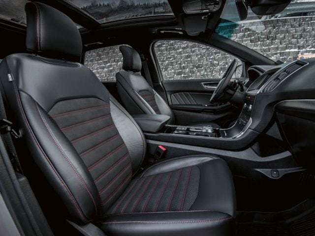 The Ford Edge has an impressive and practical interior, with an instrument panel, door trim, and floor console. The vehicle also has comfortable floormats, a red-stitched steering wheel, and race-like paddle shifters. The seats are leather-trimmed with supportive bolsters, and Miko inserts.