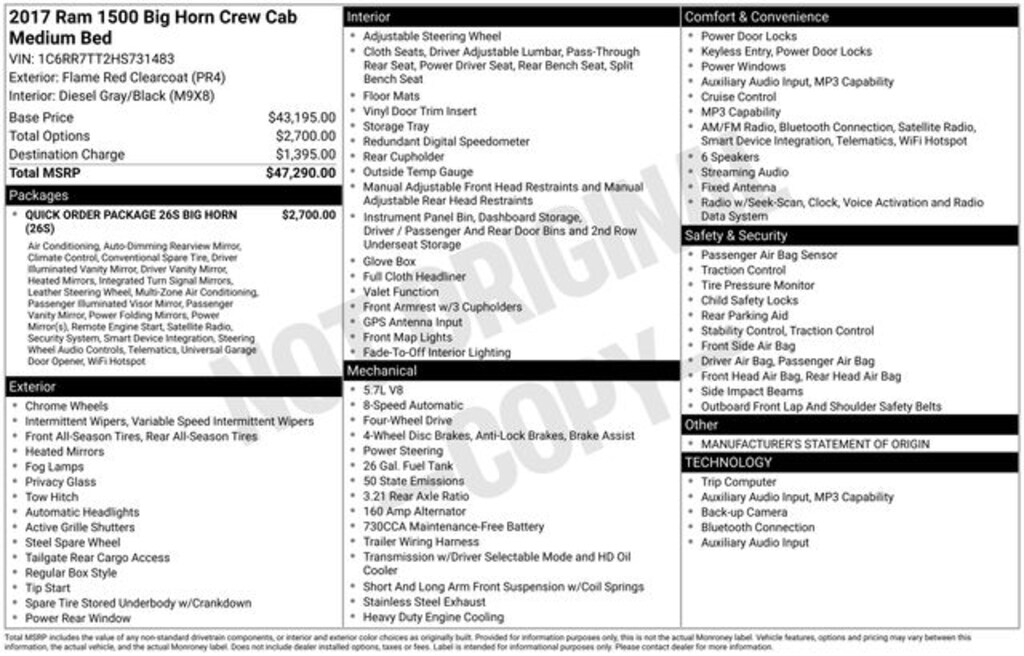 Back up Camera, 150 Ford Inspected in our Certified Ford Service Center, USB / AUX ports, Bluetooth / Handsfree, Cruise Control, Air Conditioning ATC w/Dual Zone Control, Auto-Dimming Exterior Mirrors, Auto-Dimming Rear-View Mirror, Big Horn Badge, Big Horn Regional Package, Bright/Bright Billets Grille, Class IV Receiver Hitch, Dual Rear Exhaust w/Bright Tips, Electric Shift-On-Demand Transfer Case, Electroluminescent Instrument Cluster, Exterior Mirrors Courtesy Lamps, Exterior Mirrors w/Supplemental Signals, Fog Lamps, Glove Box Lamp, Leather Wrapped Steering Wheel, LED Bed Lighting, Navigation System, Overhead Console w/Garage Door Opener, ParkSense Front/Rear Park Assist System, ParkView Rear Back-Up Camera, Power Heated Fold-Away Mirrors, Power-Folding Mirrors, Premium Cloth 40/20/40 Bench Seat, Quick Order Package 26S Big Horn, Radio: Uconnect 3C w/8.4" Display, Rear Dome w/On/Off Switch Lamp, Remote Start System, Security Alarm, Steering Wheel Mounted Audio Controls, Sun Visors w/Illuminated Vanity Mirrors, Underhood Lamp, Wheels: 20" x 8" Aluminum Chrome Clad.