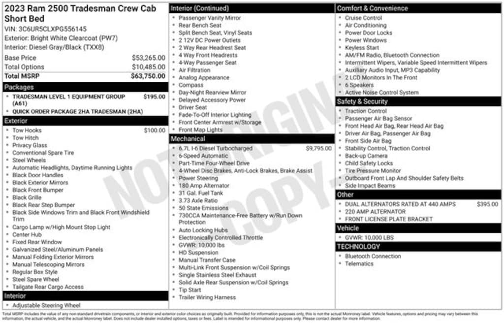 Bright White Clearcoat 2023 Ram 2500 Tradesman 4WD 6-Speed Automatic Cummins 6.7L I6 Turbodiesel